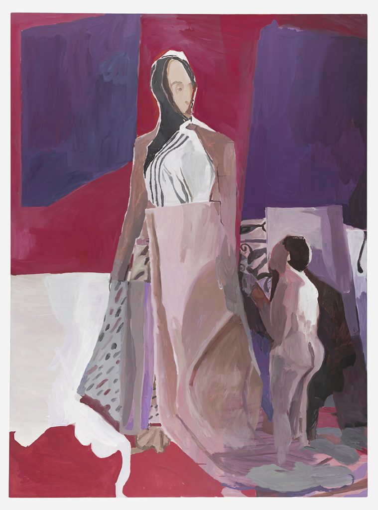 Ook Verhoevens palet zet je op het verkeerde been. Op het eerste gezicht stemt het paars, blauw en roze vrolijk, maar de kleuren gaan vrijwel altijd vergezeld van een grijze ondertoon. Daardoor ogen ze mat. De onderwerpen daarentegen zijn in de regel donkerder en allesbehalve naïef. Thematisch verbindt Verhoeven namelijk autobiografische elementen met universele thema’s zoals vruchtbaarheid en schoonheid, en stipt ze ook onderwerpen aan als machtsverhoudingen en de dood. De werken in Because vormen daarop geen uitzondering.