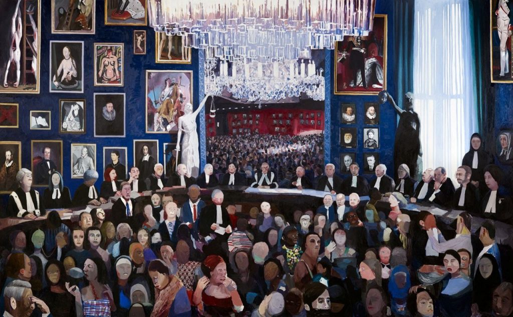 Op de wanden va de rechtszaal zien we gewezen politici, geleerden, staatshoofden en filosofen. Het meest in het oog springt het bekende schilderij van de gelynchte gebroeders De Witt van Jan de Baen. Daarvoor zit de Hoge Raad onder leiding van president, mr. Visser. Mr. Visser was de eerste joodse president van de Hoge Raad, maar werd in 1941 door de Duitse bezetters ontslagen – zonder publiekelijk protest van de andere raadsheren. Op de voorgrond zien we een menigte van treurige, boze, eenzame, lieve en vertrouwde figuren die samen onze samenleving vormen.