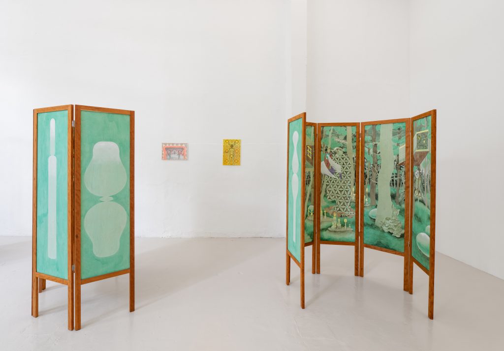 De praktijk van Fiona Lutjenhuis (Zevenaar, 1991) draait om het weergeven en herinterpreteren van de religieuze ideologieën waarmee zij opgroeide in een dorp in Noord-Brabant. Haar ouders waren er lid van een sekte die zich op een mix van theosofische ideeën, esoterische kosmologieën en het bestaan van buitenaards leven en bovennatuurlijke levensvormen baseerde. Lutjenhuis' kamerschermen, tekeningen en muurschilderingen vormen dragers van verhalen. Op poëtische wijze combineert zij esoterische, new age-esthetiek met diverse visuele invloeden uit stripboeken, Japanse prenten en middeleeuwse religieuze schilderijen.