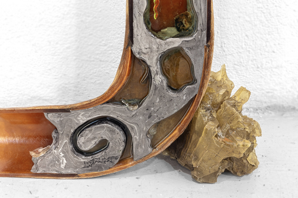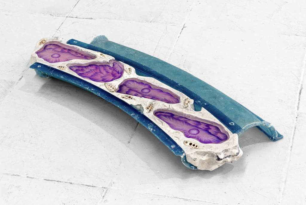 Ik volg deze reizen en probeer me voor te stellen hoe ze eruitzien vanuit het perspectief van die organismen zelf. In poëtische teksten, geschreven vanuit hun perspectief, geef ik ze een stem en beschrijf ik hoe ze zich vastklampen en ontregelen. Vanuit dit onderzoek is ook de serie ‘Clogged Pipe’ sculpturen ontstaan, waarin ik me voorstel wat je ziet wanneer je een leiding doormidden snijdt en deze organismen zichtbaar worden. Vanuit datzelfde denken ben ik ook andere lekken in globale logistieke systemen gaan onderzoeken. Elk jaar verdwijnen duizenden zeecontainers in de oceaan, met vaak absurde en mythische gevolgen. Soms duikt hun inhoud jaren later weer op: stranden vol Crocs, gele badeendjes die een eigen leven zijn gaan leiden in oceaanstromen, sommige zelfs jarenlang ingevroren in Arctisch ijs. Dit gegeven vormt de basis voor nieuw werk. In deze serie gebruik ik een rugzak als mini-container: een ogenschijnlijk gezonken menselijk object, gevuld met zeeorganismen en resten van verloren lading. In segmenten gesneden wordt de rugzak een hybride technofossiel: een object waarin economie en ecologie, verval en overleving samenkomen. Werk uit die laatste twee series zal ik ook laten zien in de Prospects sectie van het Mondriaan Fonds op Art Rotterdam.