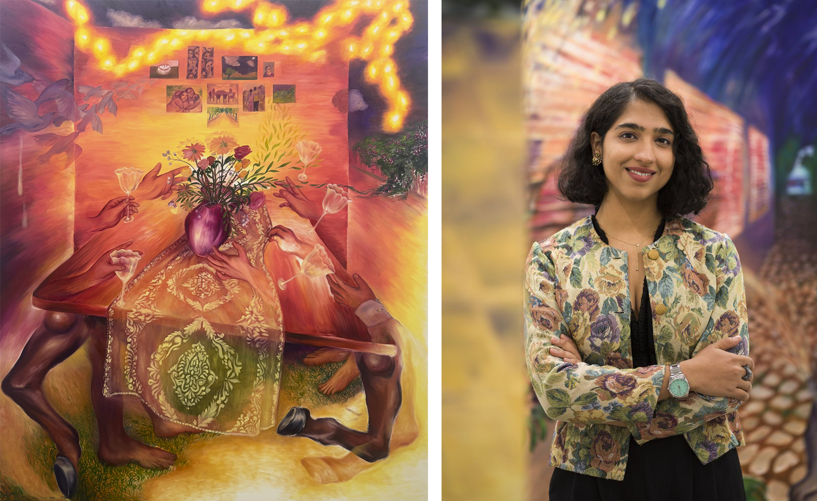 Links: Shivangi Kalra | When all goes down with the sun, oil on canvas, 2026 | New Art Section | Galleria Doris Ghetta | Rechts: Portret Shivangi Kalra | Foto: Tiberio-Sorvillo