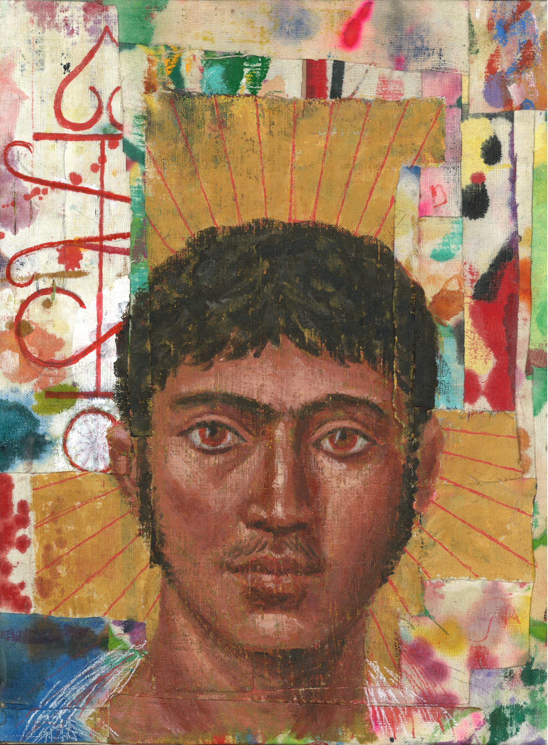 The body of paintings shown at Art Rotterdam is made with acrylic paint on studio rags and material cut from failed or abandoned paintings, mounted on panels. Many works consist of ripped or torn pieces of canvas and linen collaged together. Even when painted over completely, the seams of the surface remain visible and the history of the materials appears along the edge of the panel. “They remind me of mummy rags and bathroom graffiti,” the artist explains. “I am also looking closely at Fayum tomb portraiture and the grisaille paintings of Mantegna and Bellini. Some paintings draw on my work with sigil magic and occult abstraction to explore and amplify the solar phallic cults of antiquity, Heliogabalus being an outstanding and perverse example of one.”